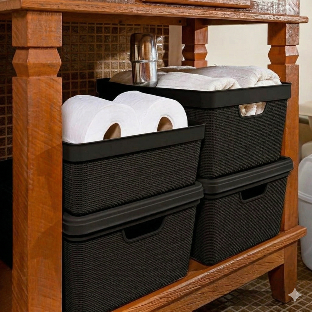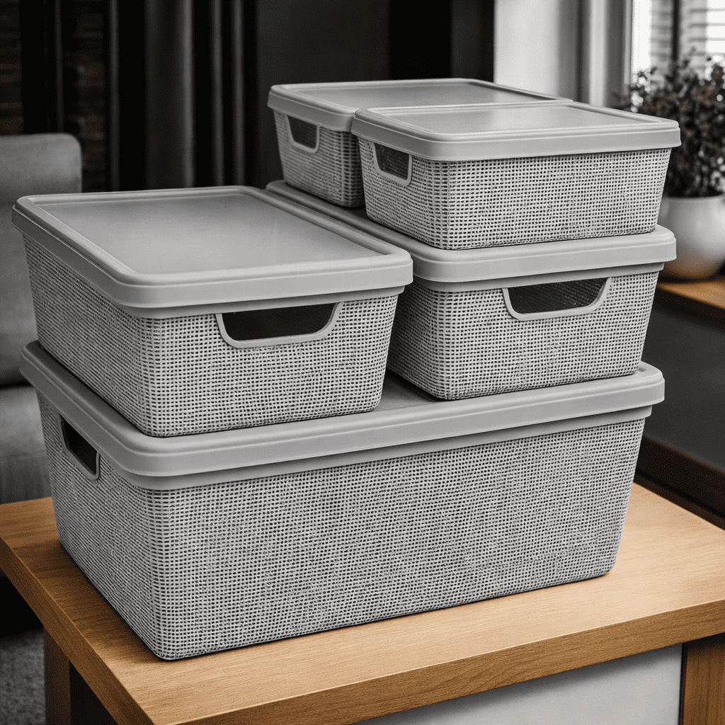 Diga adeus à bagunça com um conjunto que entende suas necessidades reais. Este kit de 5 caixas oferece a solução modular perfeita: utiliza como unidades de 1,8 L para pequenos itens de escritório, as de 5 L para produtos de higiene e uma generosa caixa de 15 L para organizar a lavanderia ou brinquedos.